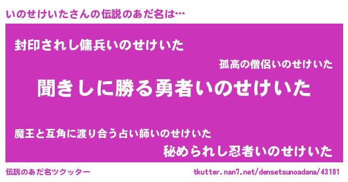 | ヒーロー風カッコイイあだ名 | 『仮面イノダー』『ネオイノセケイタ』 |