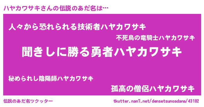 | ヘコむあだ名 | 『ハヤカワサキ(遠い目)』『ハヤを』 |