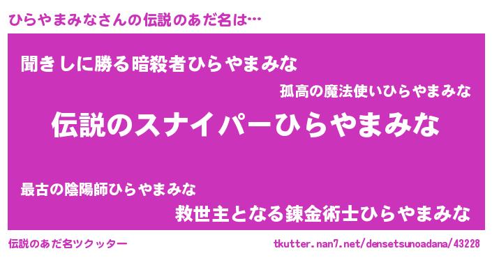 | ヘコむあだ名 | 『ひらっふぃ~』『ひらやまみな(笑)』 |