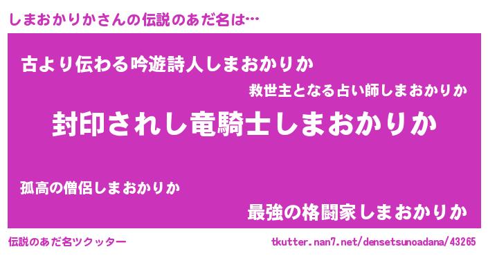 | 胡散臭い通販商品みたいなあだ名 | 『億万長者になれるブレスレット…その名も「しまおかりか」』 |