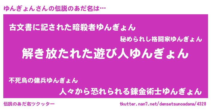 | 男性向けラノベタイトル風あだ名 | 『この素晴らしい世界にゆんぎょんを!』 |