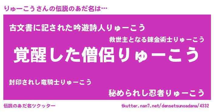 | ヒーロー風カッコイイあだ名 | 『天弓騎士リュ』『ネオリューコウ』 |
