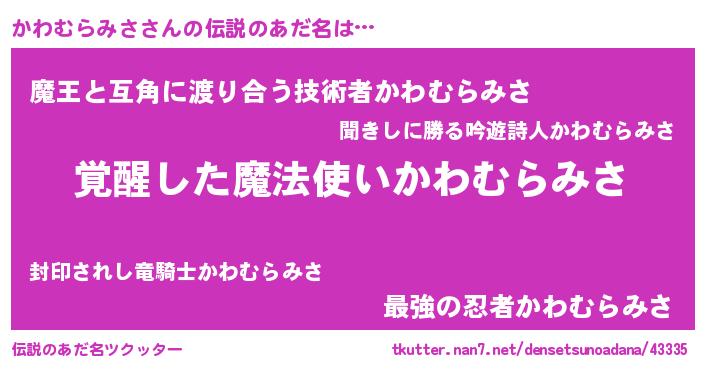 | 意味不明あだ名 | 『とにかく怪しいかわむらみさ』 |