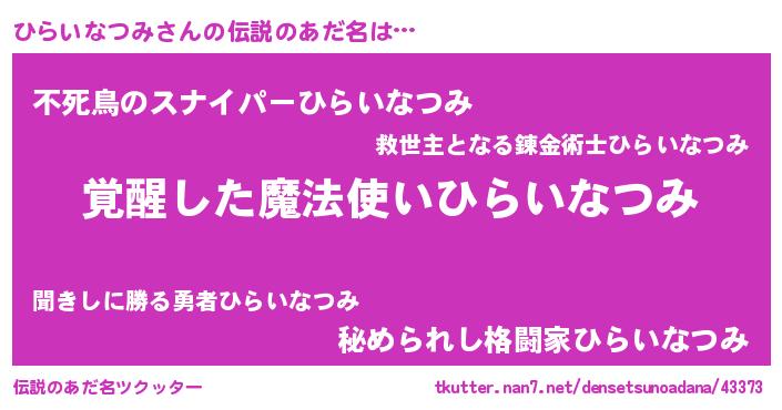| 女子向けラノベタイトル風あだ名 | 『ひらいなつみの玉の輿計画!』 |