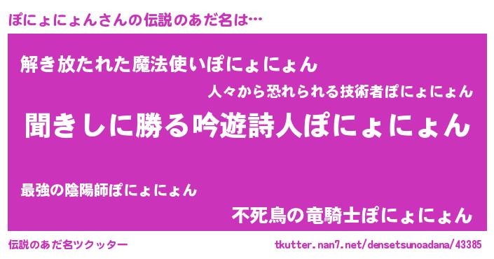 | 女子向けラノベタイトル風あだ名 | 『異世界で失敗しない100のぽにょにょん』 |