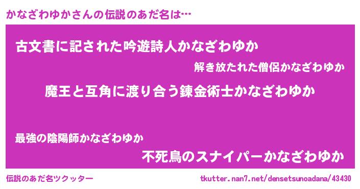 | ヘコむあだ名 | 『かなざわゆか(震え声)』『かなっふぃ~』 |