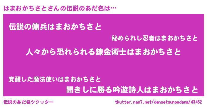 | 男性向けラノベタイトル風あだ名 | 『おまえをオタクにしてやるから、俺をはまおかちさとにしてくれ! 』 |
