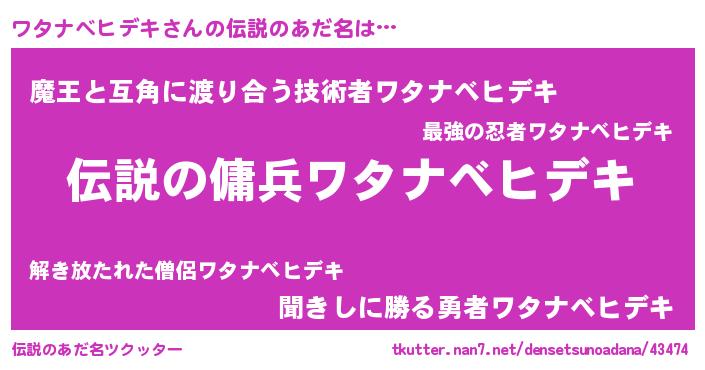 | ヘコむあだ名 | 『ワタにゅー』『ワタナベヒデキ(笑)』 |