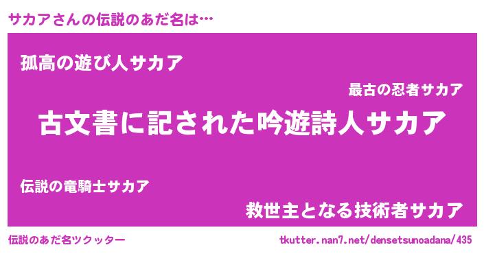 | 男性向けラノベタイトル風あだ名 | 『この素晴らしい世界にサカアを!』 |