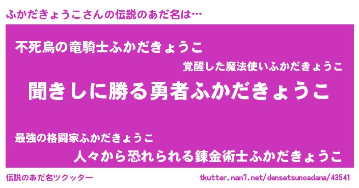 | ヘコむあだ名 | 『ふかだきょうこ(苦笑)』『ふかにー』 |