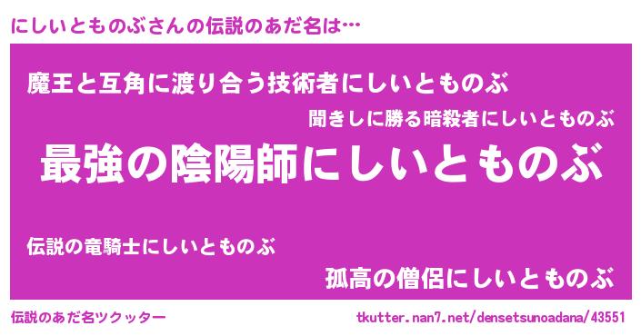 | 意味不明あだ名 | 『にしいとものぶフォーエバー』 |