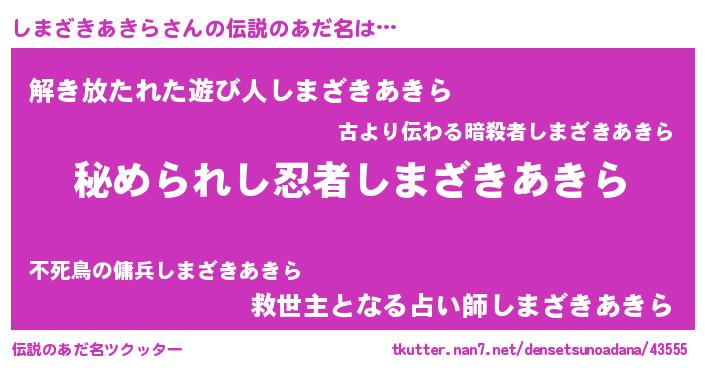 | 男性向けラノベタイトル風あだ名 | 『シマザキアキラスレイヤー』 |