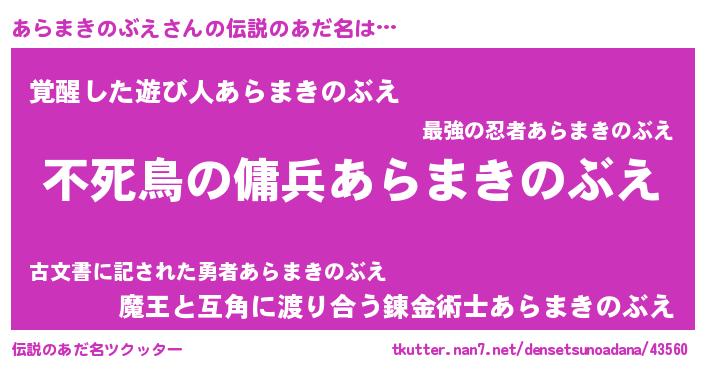 | 女子向けラノベタイトル風あだ名 | 『あらまきのぶえ姫と円卓の騎士』 |