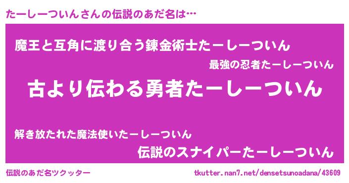 | ヒーロー風カッコイイあだ名 | 『ネオターシーツイン』『仮面ターダー』 |