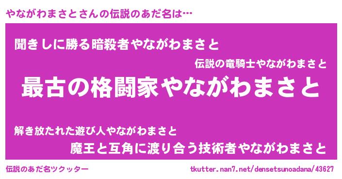 | 男性向けラノベタイトル風あだ名 | 『Re:やながわまさとから始める異世界生活』 |