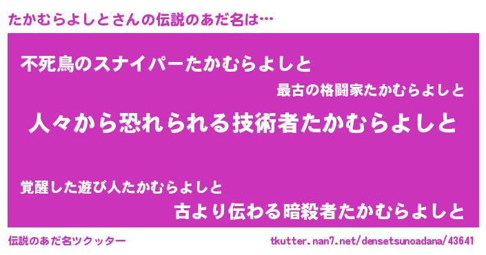 | 男性向けラノベタイトル風あだ名 | 『おまえをオタクにしてやるから、俺をたかむらよしとにしてくれ! 』 |