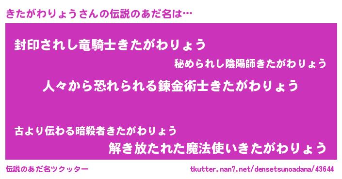 | 男性向けラノベタイトル風あだ名 | 『キタガワリョウスレイヤー』 |