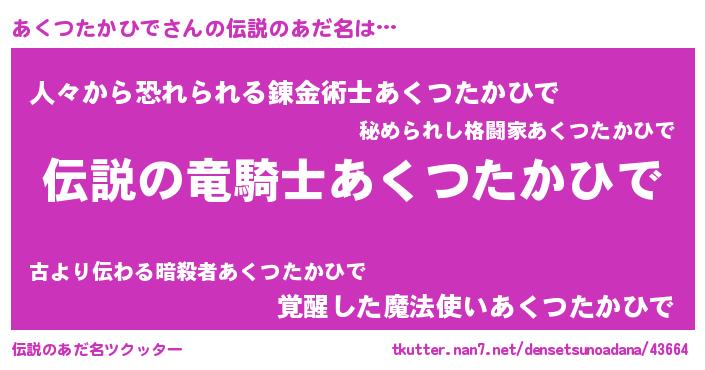 | 男性向けラノベタイトル風あだ名 | 『あくつたかひでの憂鬱』 |