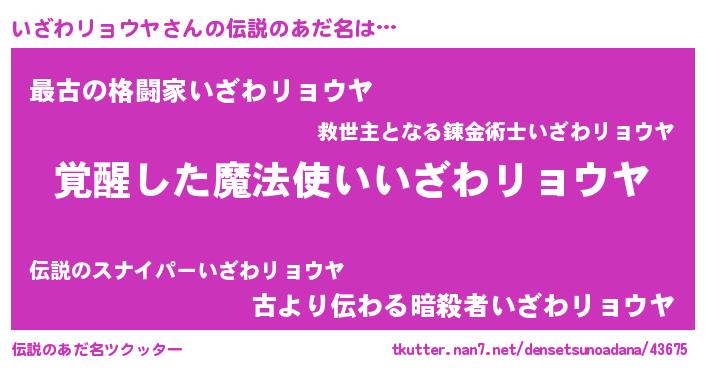 | 男性向けラノベタイトル風あだ名 | 『Re:いざわリョウヤから始める異世界生活』 |