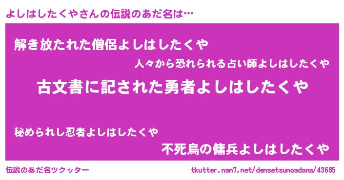 | ヘコむあだ名 | 『よしはしたくや(苦笑)』『よしっぺ』 |