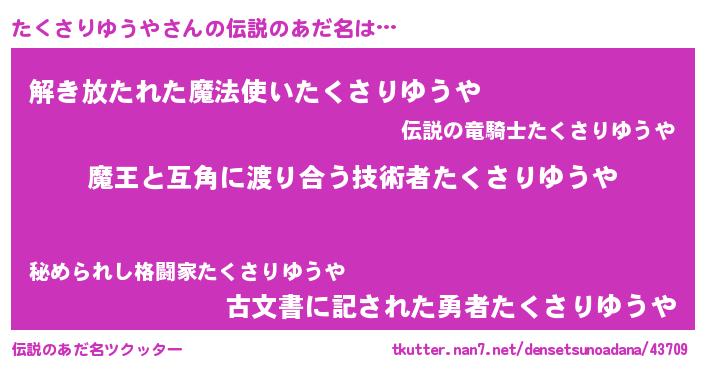 | 男性向けラノベタイトル風あだ名 | 『魔弾の王とたくさりゆうや』 |
