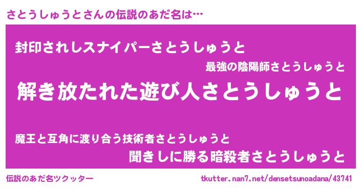 | 意味不明あだ名 | 『住所不定無職さとうしゅうと(85歳)』 |
