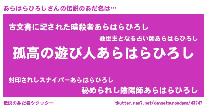 | 女子向けラノベタイトル風あだ名 | 『あらはらひろしが死なない童話 林檎のあらはらひろしの診療簿』 |
