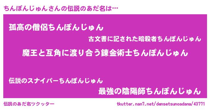 | ヒーロー風カッコイイあだ名 | 『慈愛の使者ちんぽんじゅん』 |
