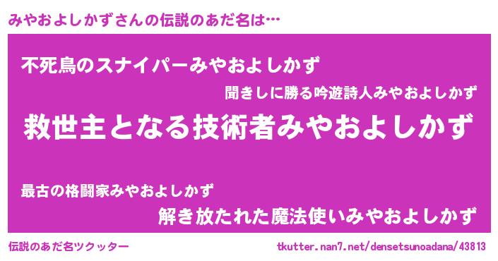 | 男性向けラノベタイトル風あだ名 | 『うちのみやおよしかずが世界を掌握している!』 |