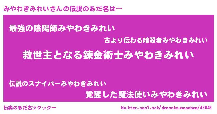 | 男性向けラノベタイトル風あだ名 | 『みやわきみれい~年齢イコール彼女いない歴の魔法使い~』 |