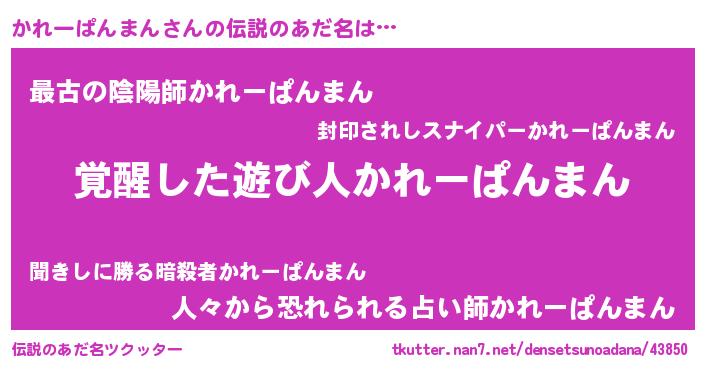 | 男性向けラノベタイトル風あだ名 | 『かれーぱんまんの嫁は女の子じゃないと思った?』 |