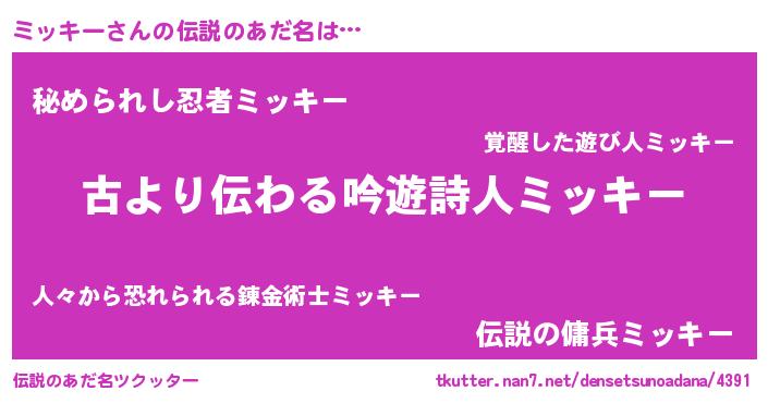 | 男性向けラノベタイトル風あだ名 | 『ミッキーに滅ぼされるだけの簡単なお仕事です』 |