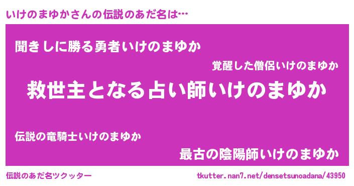 | 男性向けラノベタイトル風あだ名 | 『Re:いけのまゆかから始める異世界生活』 |