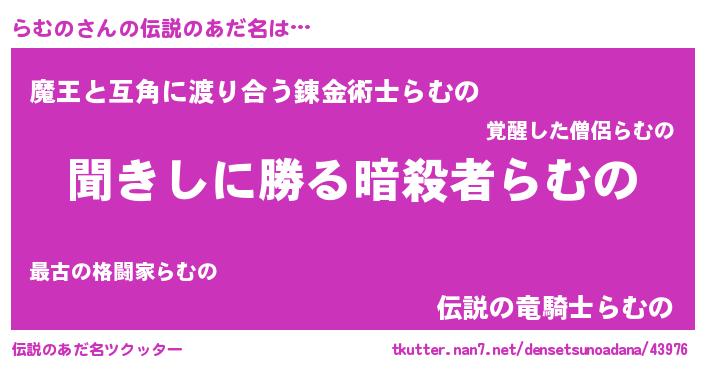 女子向けラノベタイトル風あだ名 | 『らむのが死なない童話 林檎のらむのの診療簿』 |