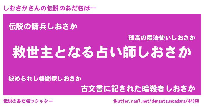 | ヒーロー風カッコイイあだ名 | 『慈愛の使者しおさか』『ネオシオサカ』 |
