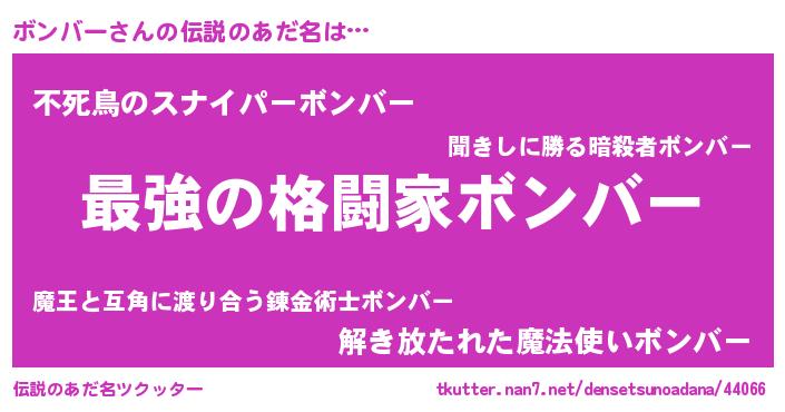 | 男性向けラノベタイトル風あだ名 | 『ボンバー~年齢イコール彼女いない歴の魔法使い~』 |