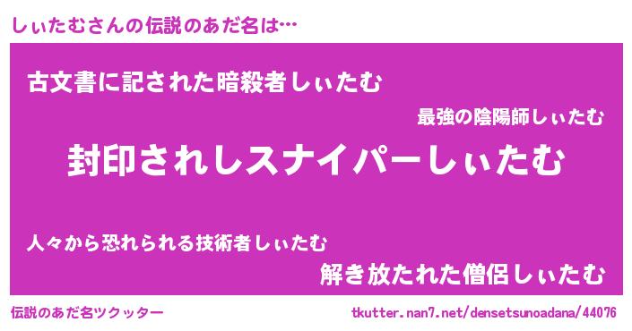 | 意味不明あだ名 | 『ペロリンしぃたむ』『自称しぃたむ』 |