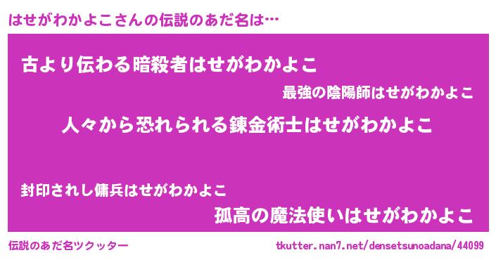 | ヘコむあだ名 | 『はせがわかよこ(苦笑)』『はせっ子』 |