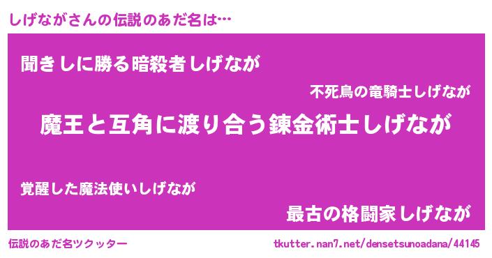 | 男性向けラノベタイトル風あだ名 | 『この素晴らしい世界にしげながを!』 |