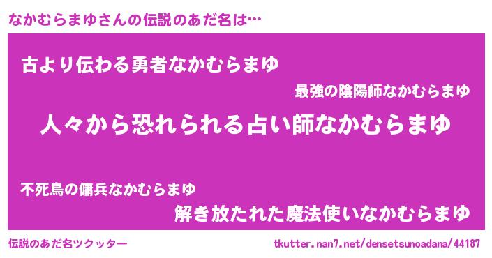 | ヘコむあだ名 | 『なかむらまゆ(爆)』『なかぷりん』 |