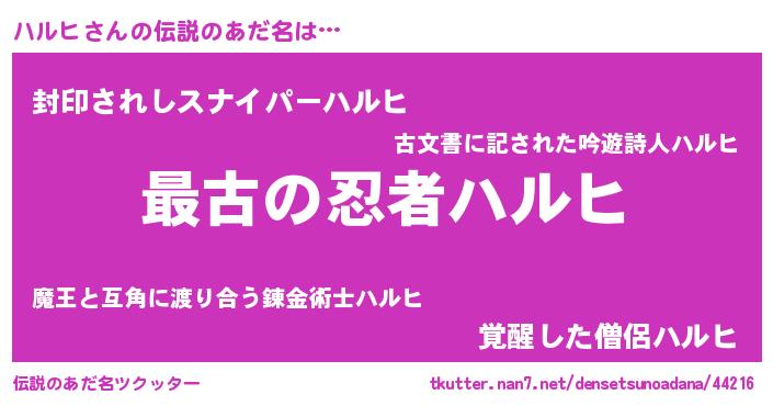 | ファンタジー風あだ名 | 『エターナルハルヒー』『ハルフェル』 |