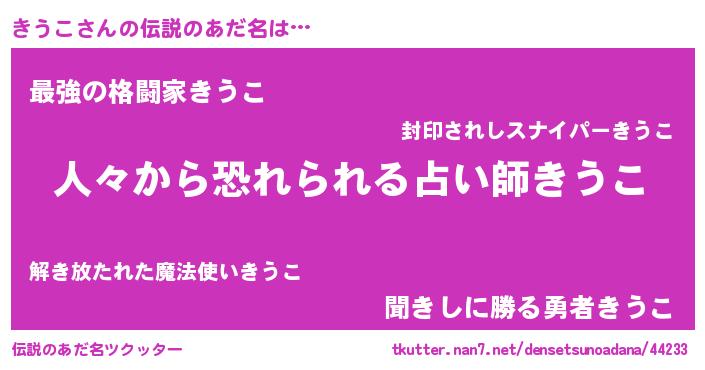 | ヒーロー風カッコイイあだ名 | 『超時空戦士キウコ』『天空の使者きうこ』 |