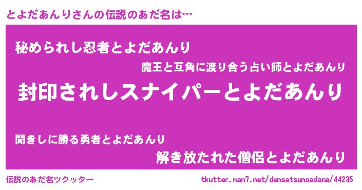 | 男性向けラノベタイトル風あだ名 | 『トヨダアンリアートオンライン』 |