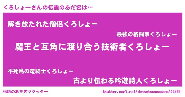 | 男性向けラノベタイトル風あだ名 | 『くろしょーに滅ぼされるだけの簡単なお仕事です』 |
