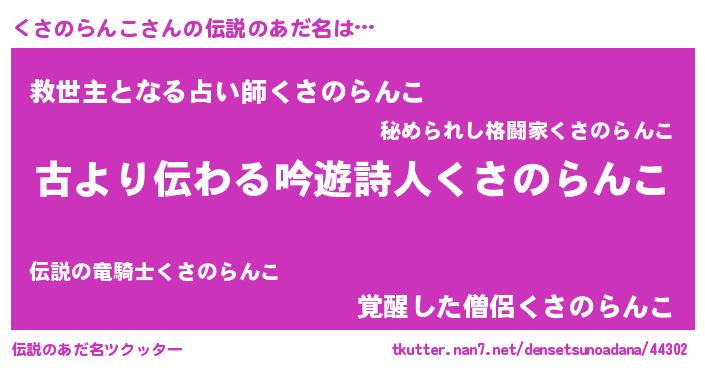 | 女子向けラノベタイトル風あだ名 | 『くさのらんこの契約王妃』 |