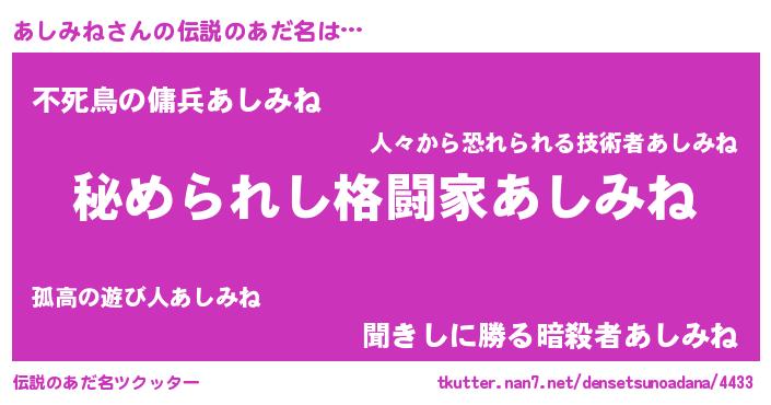| ヒーロー風カッコイイあだ名 | 『仮面アシダー』『ウルトラあしみねマン』 |