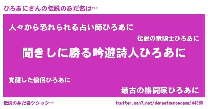| ヒーロー風カッコイイあだ名 | 『ネオヒロアニ』『慈愛の使者ひろあに』 |