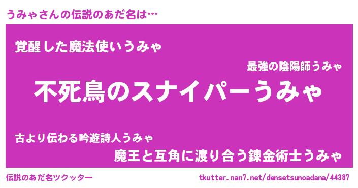 | 男性向けラノベタイトル風あだ名 | 『うみゃの憂鬱』『魔法科高校のうみゃ』 |