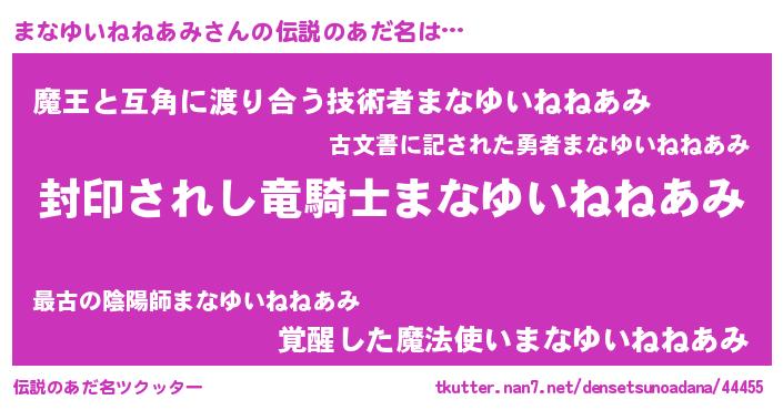 | ヒーロー風カッコイイあだ名 | 『最強戦士マナユイネネアミ』 |
