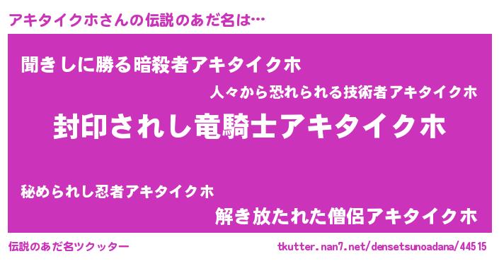 | ヒーロー風カッコイイあだ名 | 『スーパーアキタイクホ』『仮面アキダー』 |